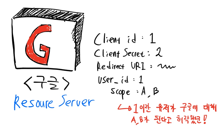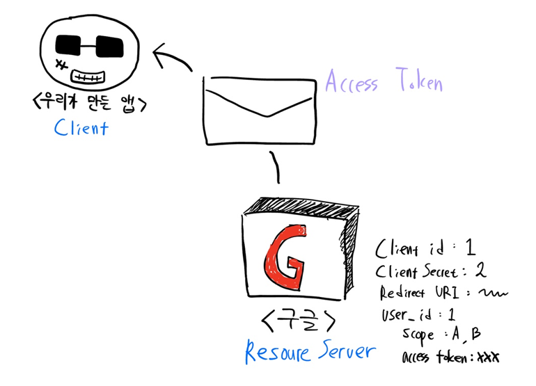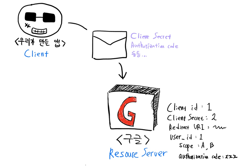 - Client는 이를 접수(?)하고 Resource Server(구글 등)에게 전달
