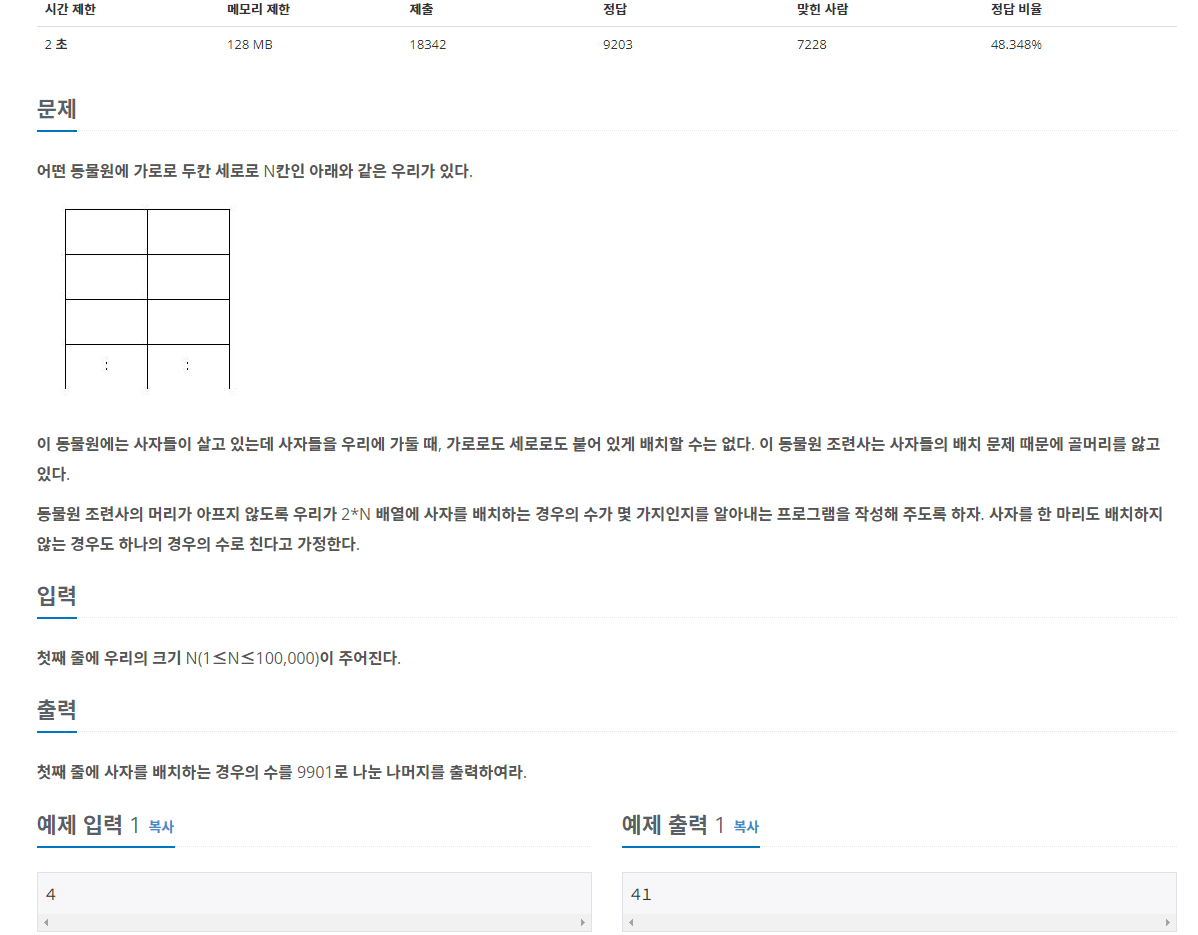 즉 dp[x]를 x개의 행(즉 2*x칸의 우리)에 사자들을 배치하는 방법이라 하면, dp[x] = dp[x][left] + dp[x][right] + dp[x][no]라는 3가지 케이스로 보는 게 더 편하다는 것임