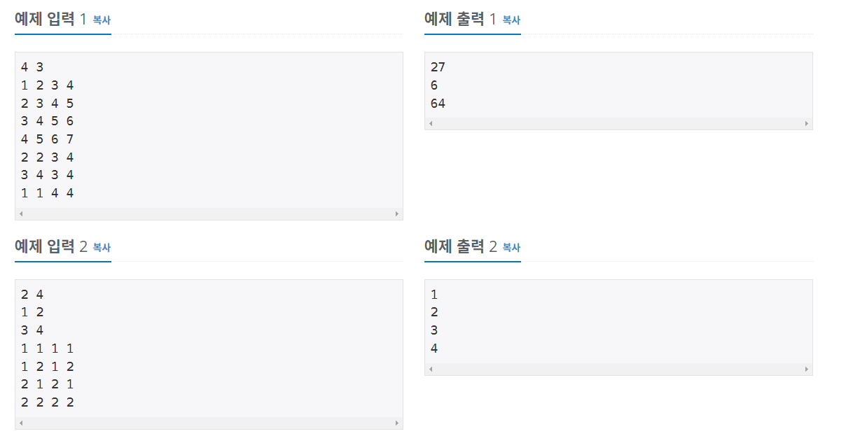 첫째 줄에 표의 크기 N과 합을 구해야 하는 횟수 M이 주어진다. (1 ≤ N ≤ 1024, 1 ≤ M ≤ 100,000) 둘째 줄부터 N개의 줄에는 표에 채워져 있는 수가 1행부터 차례대로 주어진다. 다음 M개의 줄에는 네