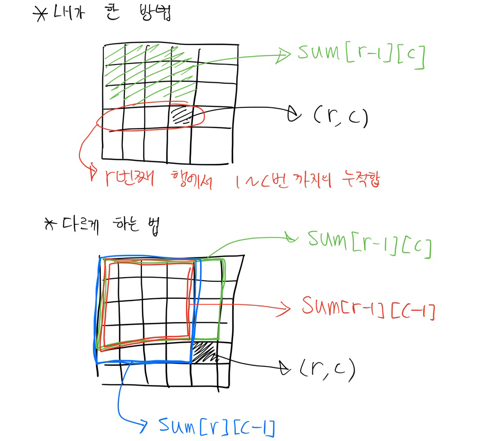 sum[r][c] = sum[r - 1][c] + sum[r][c - 1] - sum[r - 1][c - 1] + r번째 행에서 c번값