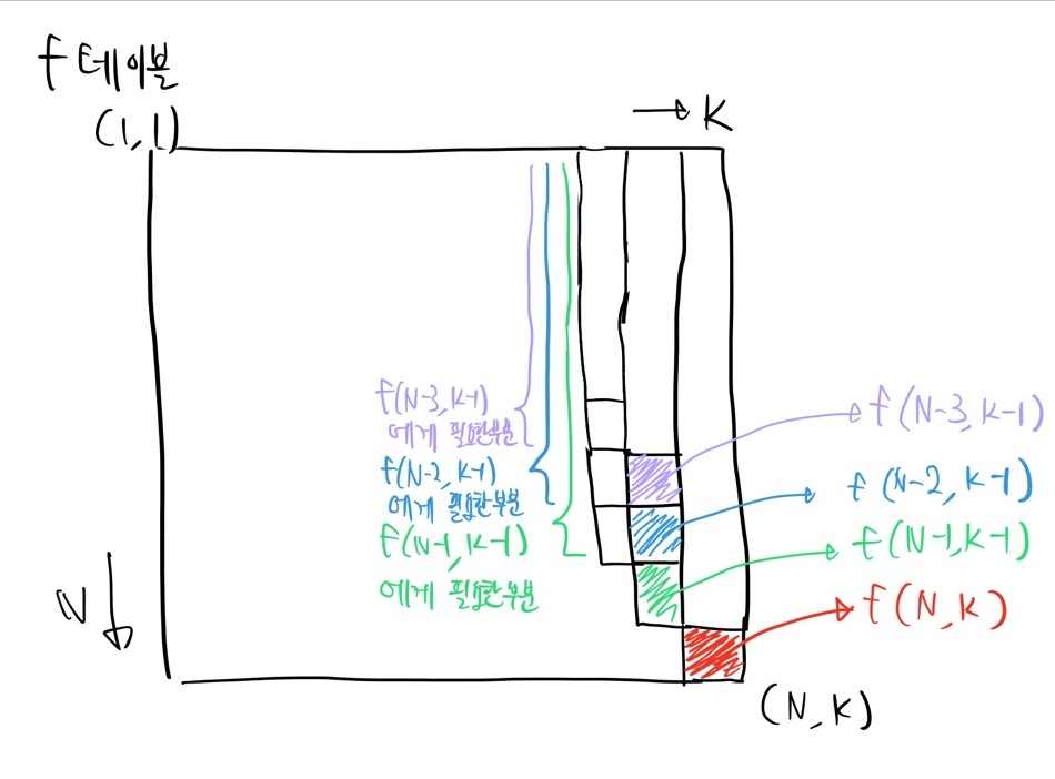 f(N, K)를 구하기 위해선 f(N-1, K-1), f(N-2, K-1), f(N-3, K-1)...를 구해야 한다. (바로 위 #2에서 부분문제 쪼개는 부분 참고)