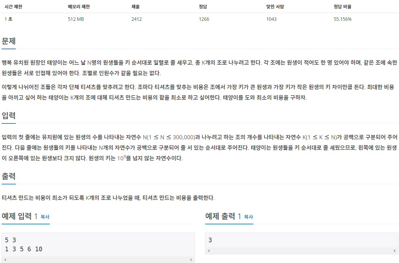 입력의 첫 줄에는 유치원에 있는 원생의 수를 나타내는 자연수 N(1 ≤ N ≤ 300,000)과 나누려고 하는 조의 개수를 나타내는 자연수 K(1 ≤ K ≤ N)가 공백으로 구분되어 주어진다. 다음 줄에는 원생들