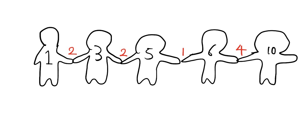 이게 왜 답이 되는지는 좀만 생각해보면 나올 수 있었다. 키 순서대로 서 있는 애들이 각자 손을 잡고 있다고 해보자. 즉 나는 애 앞에 서있는 애와 바로 뒤에 서있는 애와 손을 잡은 상황. 그리고 각 손에는 우리의 키 차이 만큼의 값을 가진다고 해보자.