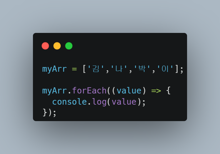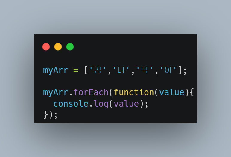 파라미터로 콜백함수를 작성하며, 이 콜백함수의 파라미터로 배열의 각각 요소들이 들어가서 콜백함수의 내용을 수행한다. 즉 콜백함수에는 파라미터 하나가 반드시 작성되어야 한다.