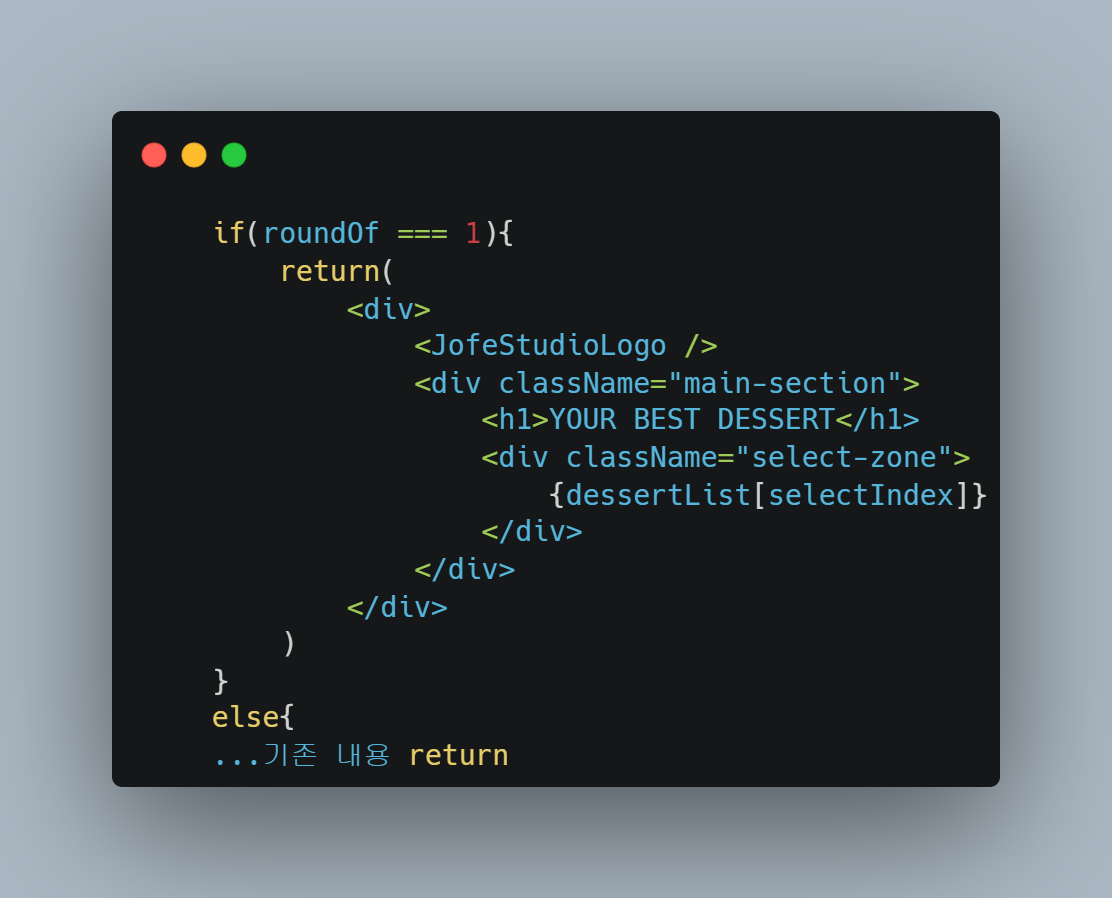 이제 딱 하나만 하면 된다. 바로 결승전에서 선택된 컴포넌트만 따로 출력하도록 하는 것! 기존에 2개씩 DessertItem이 출력되던 화면을 최종선택된 DessertItem 하나만 출력하는 식으로 화면에 렌더링되는 컴포넌트자체를 싹 바꿔야 하는 상황이었다. 옛날에 멋사에서 Django를 배울 땐 탬플릿 태그? 정확한 명칭은 기억 안나는데..암튼 그거를 통해 특정 조건 안에선 어떤 요소들이 보이게 하고 다른 조건에선 안 보이게 하고 이걸 처리하는 게 쉬웠는데, 리액트로는 이런 걸 어떻게 할 수 있을지 알아봤다. 즉 조건부 렌더링을 어떻게 처리할 수 있을지 고민한 것이다.