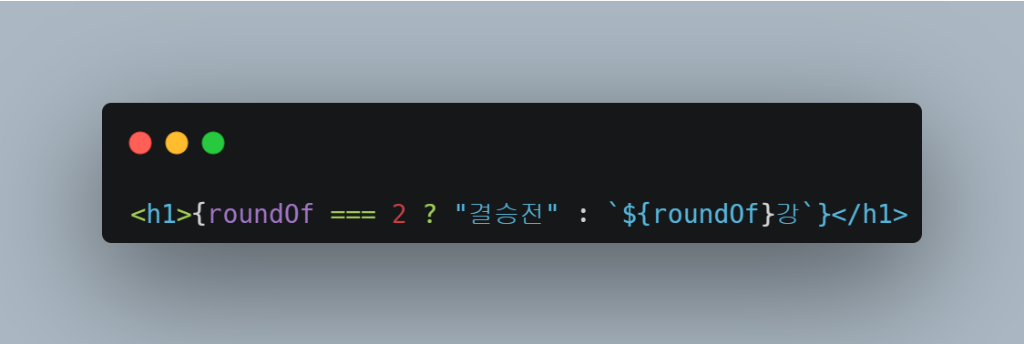 저번에 16강, 8강, 4강, 결승전이 진행되도록 설계(?)를 끝냈었다. 이제 16강일땐 16강 텍스트가 상단에 출력되고, 8강일 땐 8강, 4강일 땐 4강이 출력되고 결승전일땐 결승전이 출력되도록 해야 했다. 4강까지는 숫자 + 강의 형태이고 결승전만 결승전이 출력되도록 하면 되는 거였고, roundOf라는 state로 몇 강인지에 대한 정보를 담고 있으니 다음과 같이 표현하기로 했다.