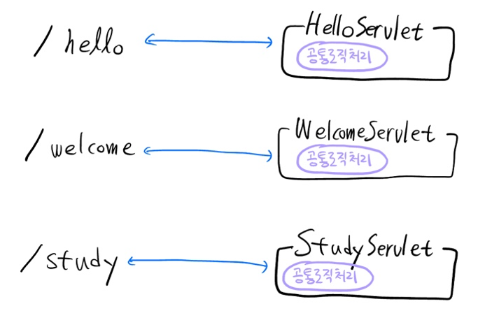 앞서 설명했듯 사용자가 입력한 url별로 서블릿이 매핑된다. 10개의 각기 다른 url들이 들어오면 10개의 서블릿들이 매핑되는 것! 그럴 때마다 서블릿들이 가지는 "공통된 로직"이 반복돼서 실행된다는 문제점이 있었다. 즉 개발 측면에서 상당히 비효율적이었음.