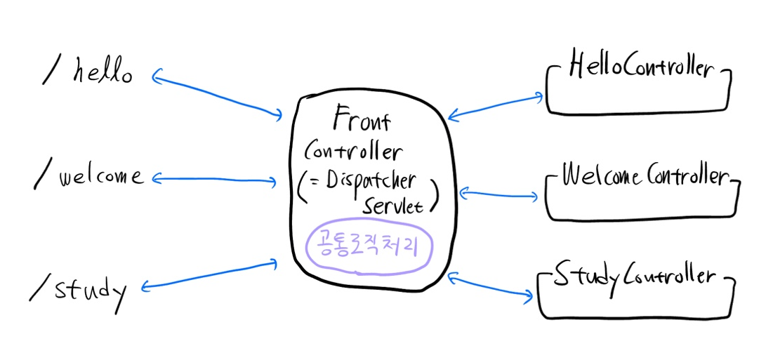 이런 점을 해결하기 위해, 클라이언트로부터의 요청을 받는 서버의 앞쪽에 모든 요청을 받는 하나의 서블릿을 두기로 했다. 그 컨트롤러가 "공통된 로직"을 수행하게 하고, 핵심 비즈니스 로직을 다른 핸들러들에게 위임하는 구조로 바꾼 거다!