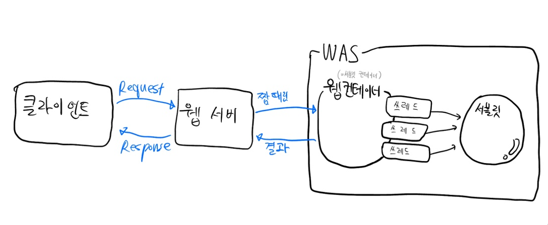 - was의 웹 컨테이너(= 서블릿 컨테이너)가 이를 받고, 처리하기 위한 쓰레드를 만듦