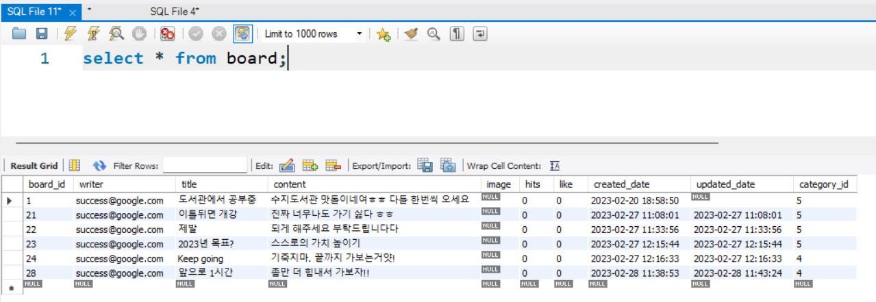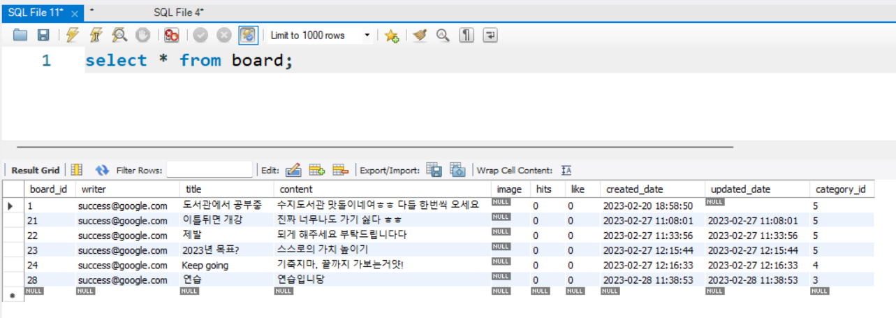 이제 한 번 시험해볼 차례! 우선 수정 전 db상황은 다음과 같았다. 여기서 28번 게시물을 바꿀 거다.