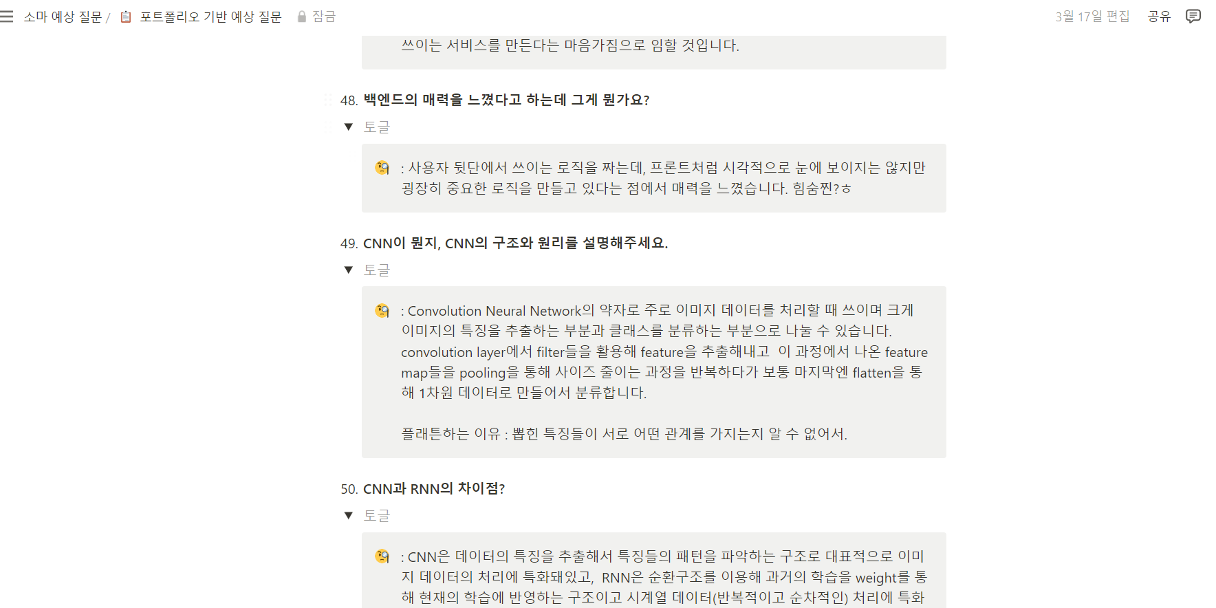 나는 포폴 자체를 나름대로 질문들을 유도하는 식으로 만들었다. (ex: 소프트 스킬을 기르기 위해 노력해오고 있습니다 → 면접관이 "소프트 스킬을 기르기 위해 어떤 노력들을 했죠?"라고 물을 수 있도록)..그래서 내 포폴을 보면서 면접관 입장에서 무러볼 만한 것들을 최대한 다 뽑아내서 준비했다. 포폴에서 나올 수 있는 기술적인 질문들은 꼬리질문들까지 최대한 준비해갔다 (ex: React를 공부해보셨는데 React의 특징이 뭐죠 ? → 방금 Virtual DOM을 말씀해주셨는데 Virtual DOM이 뭐죠?, Class Activation Map이 어떤 기술이죠 ? → Class Activation Map의 원리가 뭐죠? → CNN이 어떤 구조를 가지고 있죠 ? → Pooling이 어떤 걸 말하는 거죠 ? → Pooling의 종류가 뭐가 있죠 등등..)