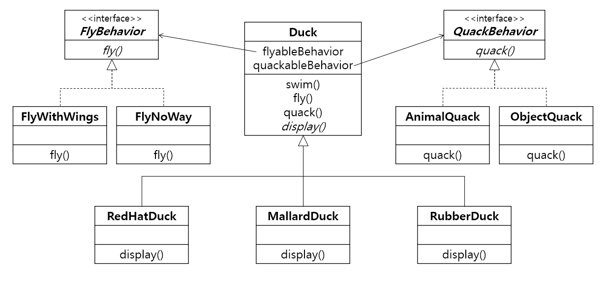 방금 방법에서 메소드와 행위 자체를 인터페이스 클래스로 분리시켰음에 주목하자. 부모클래스 Duck이 이 메소드클래스와 association을 갖게 하면 어떨까? 다음과 같이 작성할 수 있다!