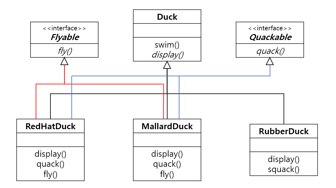 메소드, 행위 자체를 인터페이스 클래스로 바꾼다면 어떨까! 기존 부모에 있는 fly, quack을 따로 빼서 flyable, quackable이란 클래스로 만들고 나중에 fly가 가능한 애들만 flyable을 상속받고 quack이 가능한 애들만 quackable을 상속받게 하는 것이다.
