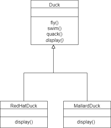 부모 Duck을 상속한 RedHatDuck, MallardDuck이 있는 상황. 이 오리들은 fly, swim, quack을 할 수 있는데, display를 하면 화면에 서로 다른 모습으로 그려진다고 하자. 그래서 fly, swim, quack은 부모에 그냥 뒀지만 display는 추상 메소드로 둬서 자식 단에서 구현하는 모습을 확인할 수 있다.