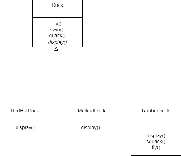 이 상황에서, RubberDuck을 만드는데 얘도 Duck을 상속받아 만들려고 한다고 하자. 문제는 이 RubberDuck은 fly를 할 수 없고, quack(꽥!!)역시 살아있는 오리들의 꽥이 아니라 모형오리를 누르면 나오는 squack이라고 하자.