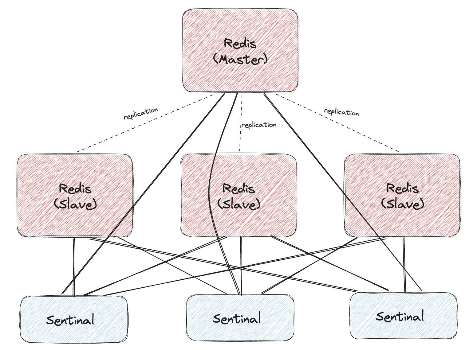 Master & Slave 구성에 센티널(Sentinal)을 추가해서 각 서버를 감시하도록 하도록 하는 아키텍처를 구성하는 것을 말한다. 센티널은 Master를 감시하고 있다가 Master가 다운되면 Slave를 Master로 승격시킨다. Redis Client(즉 Application)은 새로운 Master로 접속해서 서비스를 계속한다. 센티널은 데이터 처리는 담당하지 않으며, 센티널 자체가 다운되는 상황을 고려해 일반적으로 3대의 센티널을 운용한다.