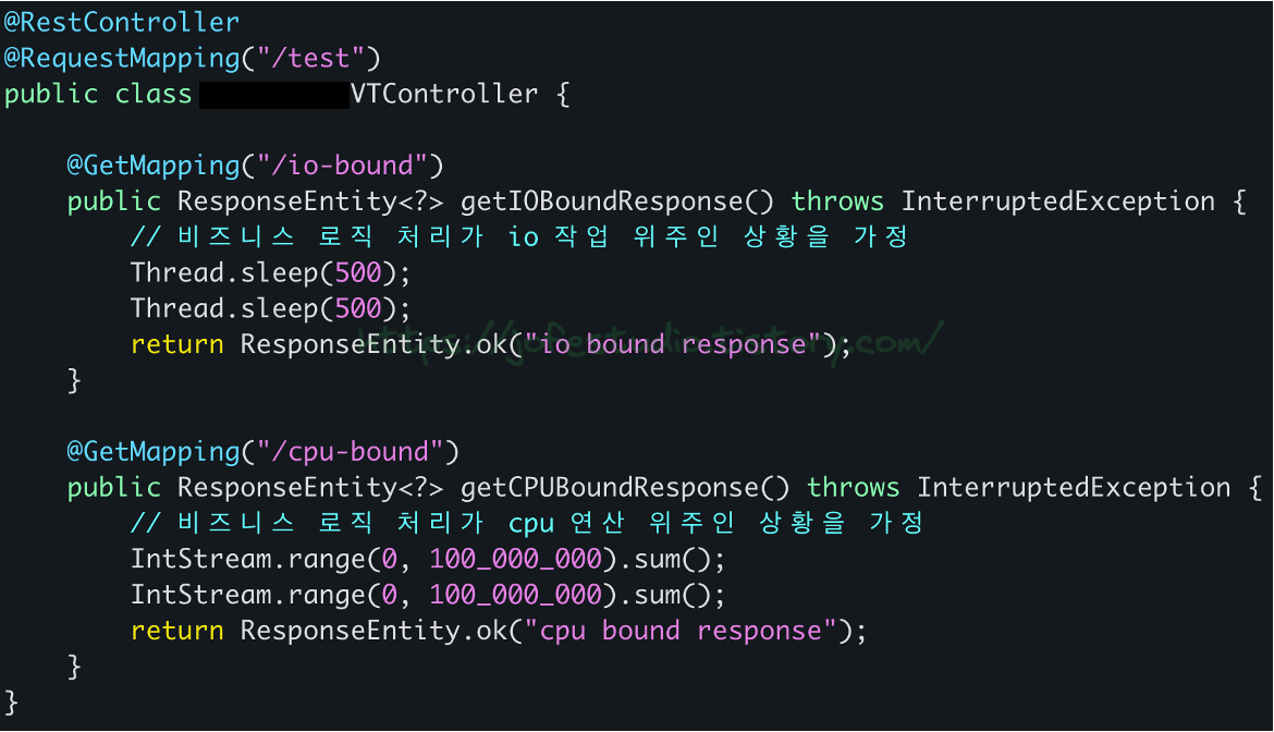 첫 번째로는 500ms씩 2번 Sleep하게 하는 API를 만들어주고, 두 번째로는 1부터 1억까지의 연산을 2번 반복하는 API를 만들어줘서 각각 I/O 작업 위주로 비즈니스 로직을 처리하는 상황과 CPU 연산 위주로 비즈니스 로직을 처리하는 상황을 가정해줍니다. 이를 토대로 I/O Bound 상황과 CPU Bound 상황에 대해, 기존 스레드 사용 시와 Virtual Thread의 사용 시의 처리량을 측정해봅니다.