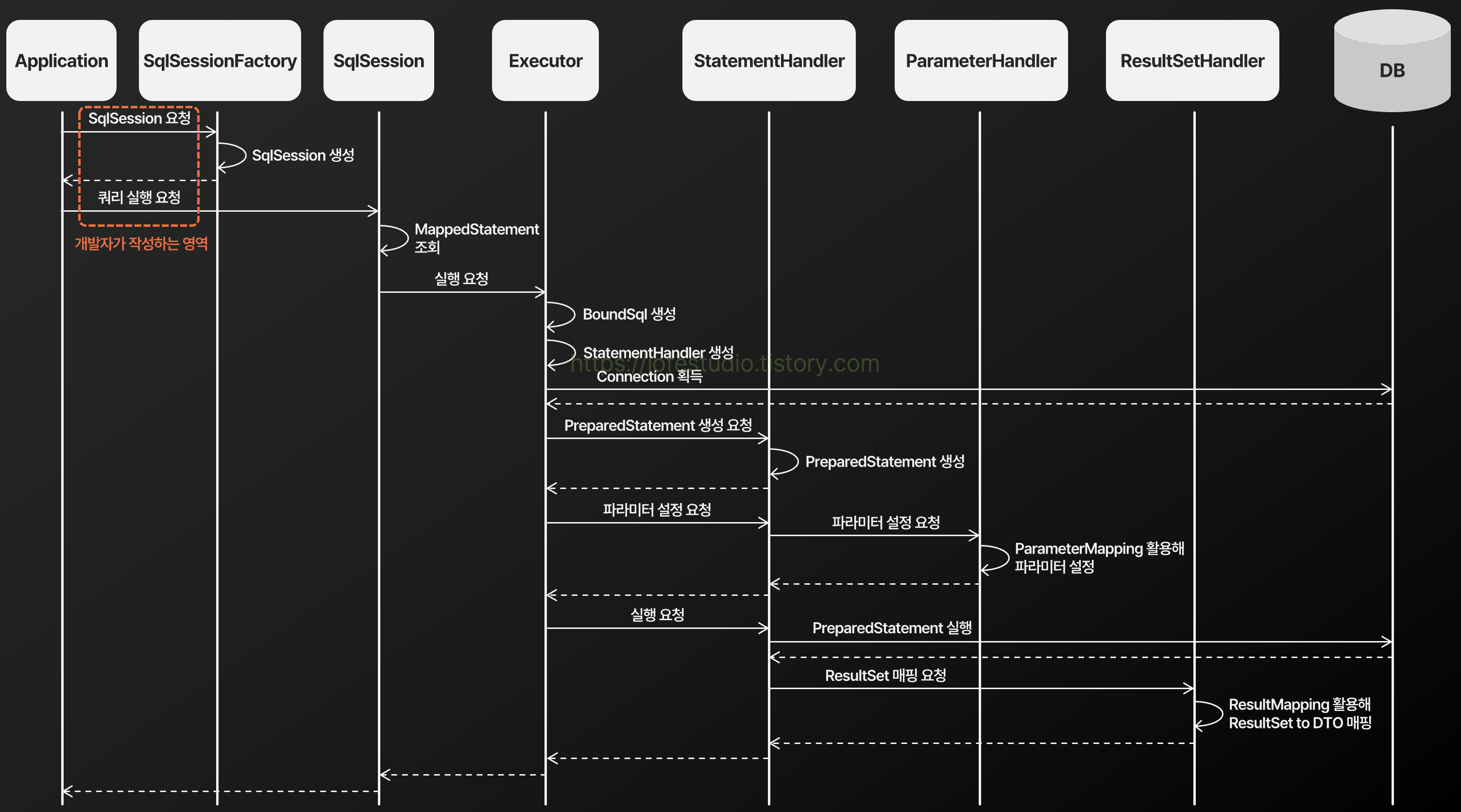 이제 Mybatis의 동작 원리를 살펴봤으니, 위 그림을 좀 더 세분화해서 다음처럼 나타낼 수 있습니다.
