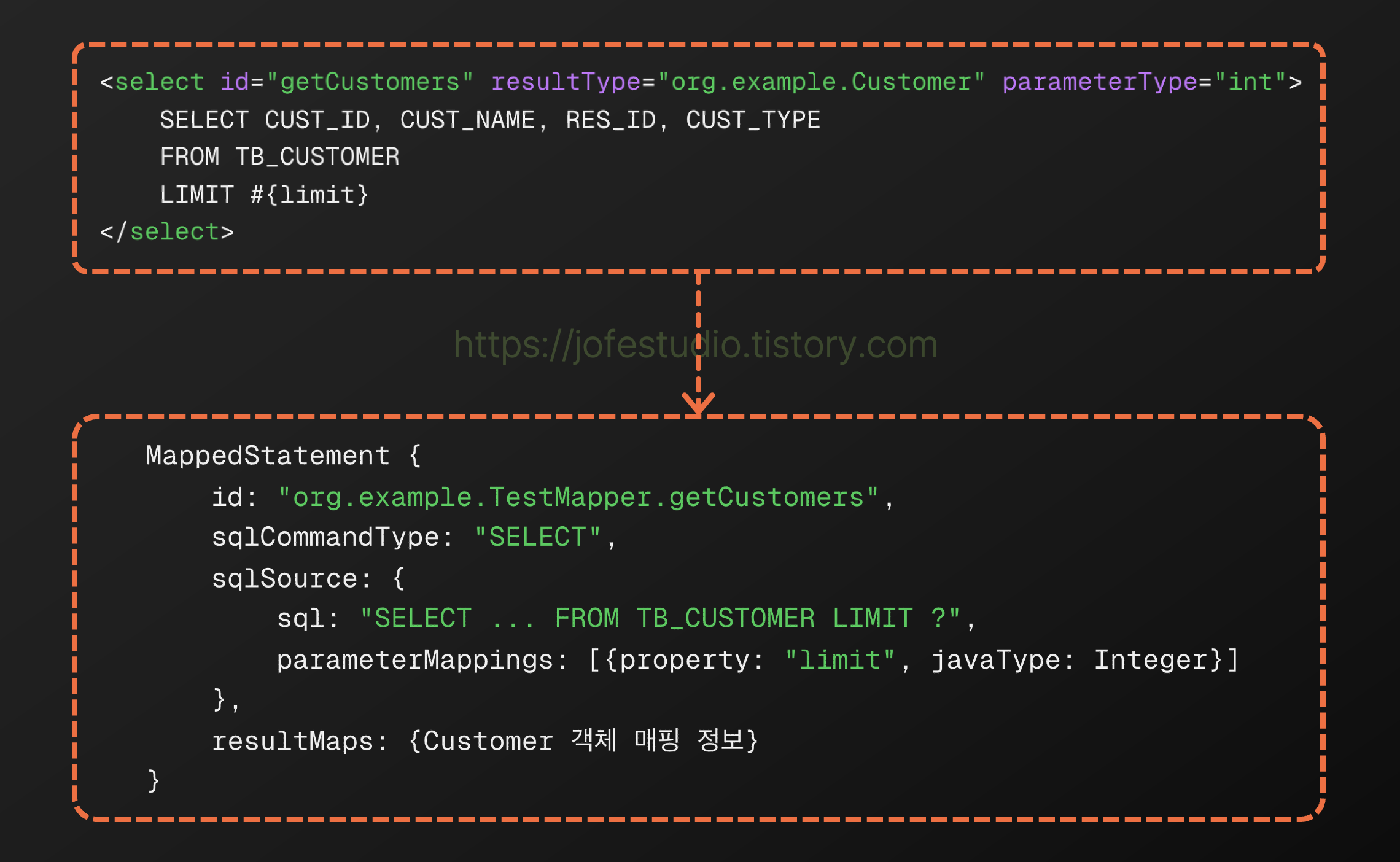 ※ MappedStatement는 Map<String, MappedStatement> 형태로 메모리에 캐싱되며, id값이 해당 SQL을 찾는 키값이 됩니다.