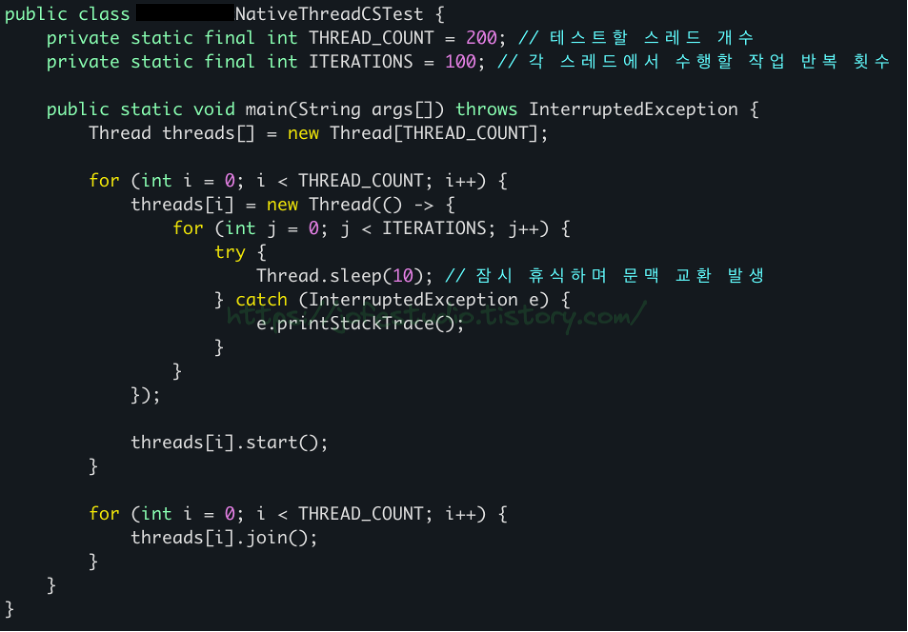 총 200개(THREAD_COUNT)의 자바 스레드를 만들고, 각각의 스레드가 10ms 동안 대기하는 과정을 100번(ITERATIONS)만큼 반복하여, 프로그램 실행 중 최소 20,000번(THREAD_COUNT X ITERATIONS) 이상의 Context Switching이 발생하도록 합니다. 동일한 코드를 Virtual Thread를 활용한 방식으로도 작성해줍니다.