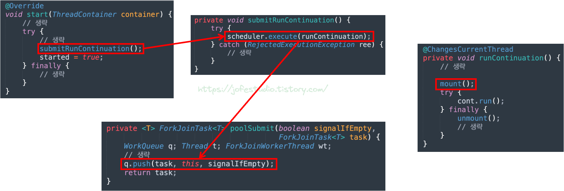 동작 방식 설명 전 Virtual Thread의 주요 구성 요소들을 살펴보면 다음과 같습니다.