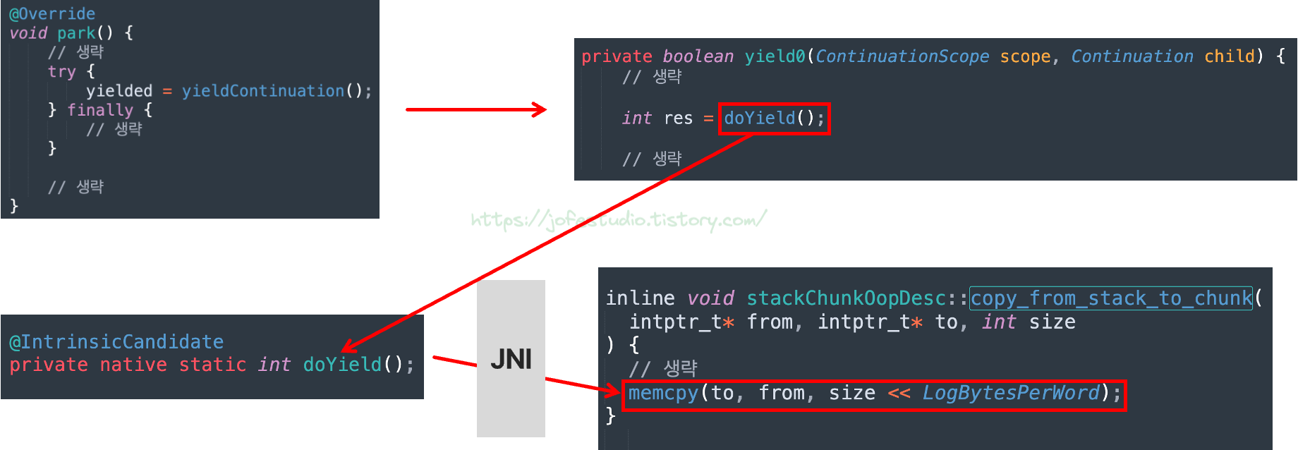 Virtual Thread가 실행되다가 I/O 요청 등으로 인해 Blocking되면 내부적으로 park메서드가 호출됩니다. park메서드는 doYield라는 native 메서드를 거쳐 JNI를 통해 jvm단에서 memcpy라는 표준 C 라이브러리 함수를 호출하게 됩니다. Virtual Thread가 사용 중이던 스택 프레임을 Heap에다가 복사해두는 기능을 수행하는 것이며, 이를 통해 나중에 Blocking이 끝나고 Virtual Thread가 재개될 때 중단 지점부터 재개하는 것이 가능해집니다. 참고로 CPU에서 사용되던 PC 레지스터 값 등도 함께 Heap에 복사되는 과정도 코드를 분석해보면 보실 수 있습니다. (저는 GitHub에 있는 openjdk를 뜯어봤습니다)