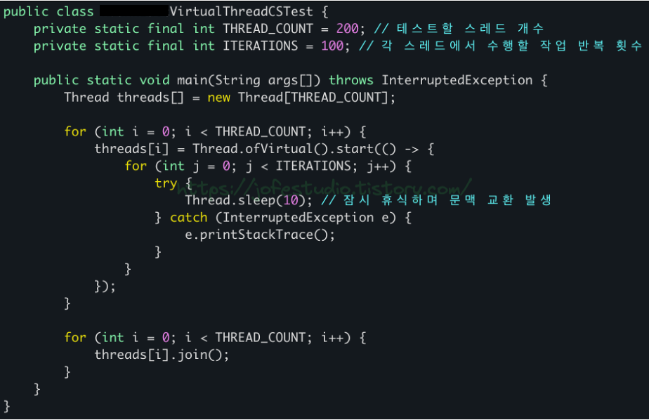총 200개(THREAD_COUNT)의 자바 스레드를 만들고, 각각의 스레드가 10ms 동안 대기하는 과정을 100번(ITERATIONS)만큼 반복하여, 프로그램 실행 중 최소 20,000번(THREAD_COUNT X ITERATIONS) 이상의 Context Switching이 발생하도록 합니다. 동일한 코드를 Virtual Thread를 활용한 방식으로도 작성해줍니다.