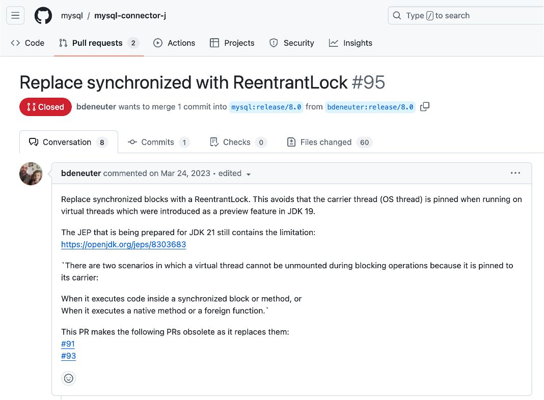 참고로 현재 여러 Java Library들이 Virtual Thread와의 호환을 위해 내부적으로 사용하던 synchronized를 ReentrantLock으로 바꾸는 작업을 진행하고 있습니다.