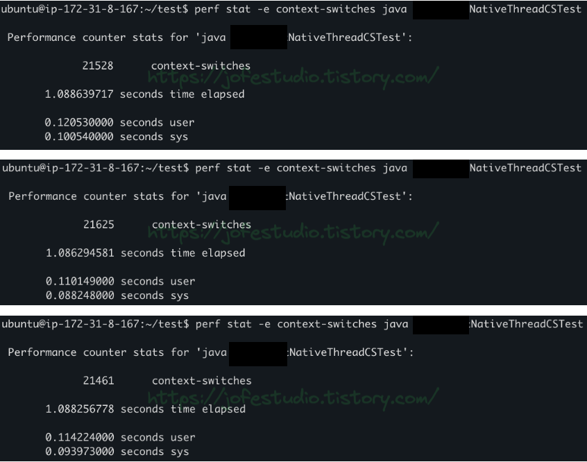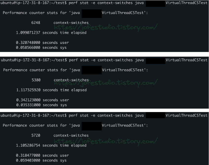 이 각각의 프로그램들을 컴파일한 뒤, Linux에서 제공하는 커널 퍼포먼스 측정 도구인 perf를 활용해 각 프로그램을 실행하는 과정에서 Context Switching이 몇 번 발생했는지 측정해줍니다. 이때 커널 레벨에서 발생한 Context Switching이 측정되는 것이므로, 정말 Virtual Thread가 Context Switching이 유저 레벨에서 발생한다면 기존 스레드를 사용했을 때가 Context Switching 횟수가 더 높게 측정될 것임을 예측할 수 있습니다.