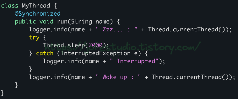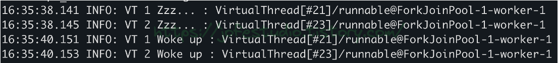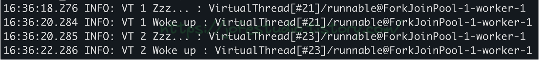 2개의 Virtual Thread를 만들어 실행하는데, 각 Virtual Thread는 현재 스레드의 정보를 로그로 남기고, 2초 대기하다가 다시 스레드의 정보를 로그로 남기는 메서드를 실행하도록 합니다. 이 때 run이란 메서드를 synchronized로 묶지 않았을 때와 묶을 때 각각 어떻게 결과가 나오는지를 테스트합니다.