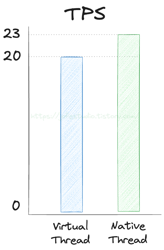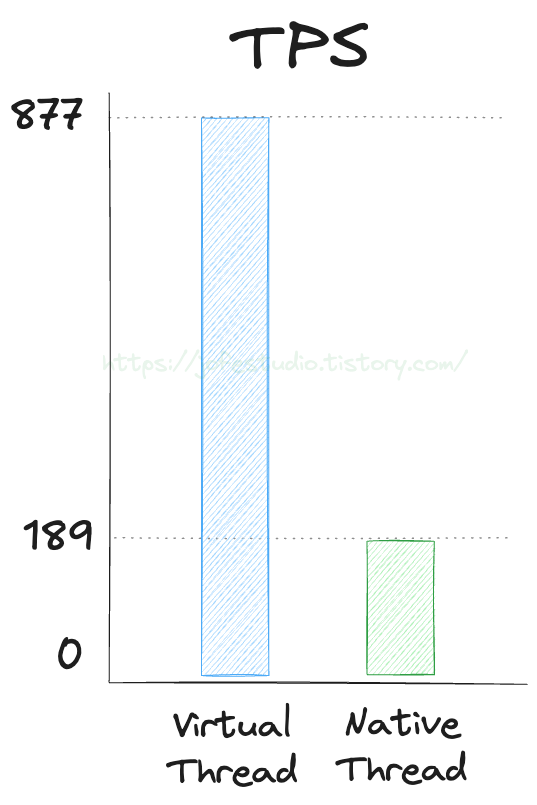 물론 간단한 코드를 기반으로 테스트한 것이므로 해당 결과가 실제 운영 환경을 대변하진 않습니다. 그래도 결과를 해석해보면, I/O Bound 상황에서 Virtual Thread는 Non-Blocking 처리가 가능하기 때문에 기존 스레드보다 더 높은 처리량을 보이고 있음을 눈으로 확인해볼 수 있습니다. 또한 Spring Boot에 내장된 톰캣의 스레드풀 사이즈를 별도로 설정해주지 않아 스레드풀 사이즈가 디폴트값인 200으로 만들어졌었는데요. 500ms씩 2번, 총 1초 정도를 대기하도록 API를 구성했기 때문에 기존 스레드를 사용한 결과가 TPS가 200 가까이는 올라가지만 200을 넘지 못하고 있는 것도 확인해볼 수 있었습니다.