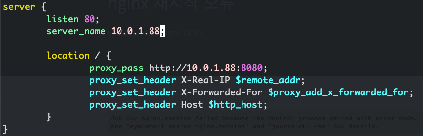 server_name에 was(spring boot)의 사설 ip를 박아뒀었다. nginx는 public subnet에 띄웠었고, was랑 같은 vpc안에 있으니 사설 ip를 통해서도 접근이 가능하기 때문에, was의 사설 ip를 server_name에 박아줘도 된다고 생각했음. 그래서 proxy_pass에 server_name에 준 주소를 그대로 써먹은 모습을 확인 가능하다.