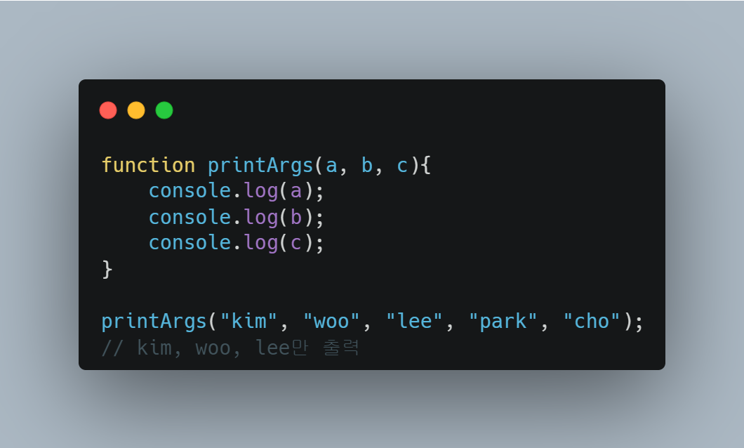 javascript에서 함수 작성 시 작성한 parameter의 수보다 더 많은 arguments를 써도 된다. 파라미터는 3개 받지만 실제 호출 시 인자들을 5개 7개 이렇게 써도 문제가 되지 않는다는 의미. 그러나 각 인자와 파라미터가 순서대로 매칭되고 남은 인자들은 낙동강 오리알 신세가 된다.